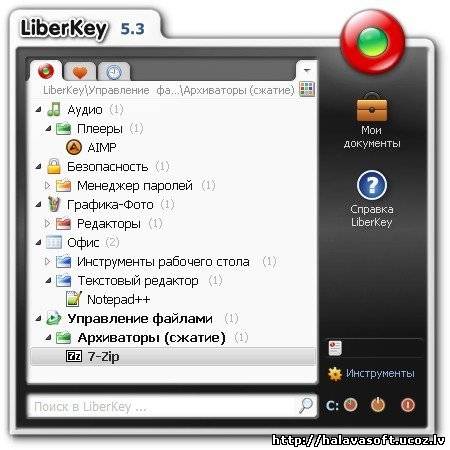 Liberkey - бесплатная программа-контейнер для хранения набора различных портативных приложений и управления ими. Программа может быть установлена как на жестком диске компьютера, так и на любом портативном устройстве. С помощью меню легко управлять приложениями в контейнере и очень просто осуществлять непосредственную загрузку новых приложений из специального онлайн каталога LiberKey (сейчас в этом каталоге имеется уже более 300 портативных бесплатных приложений, причем до 90% из них русифицированы). Большим достоинством программы является наличие механизма, обеспечивающего автоматическое обновление версий как самой программы, так и включенных в контейнер приложений.