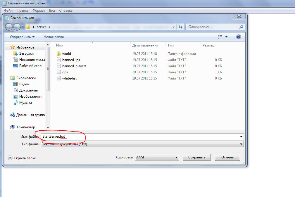 3.Потом сохраняем Блокнот в формате .bat например под именем StartServer.bat